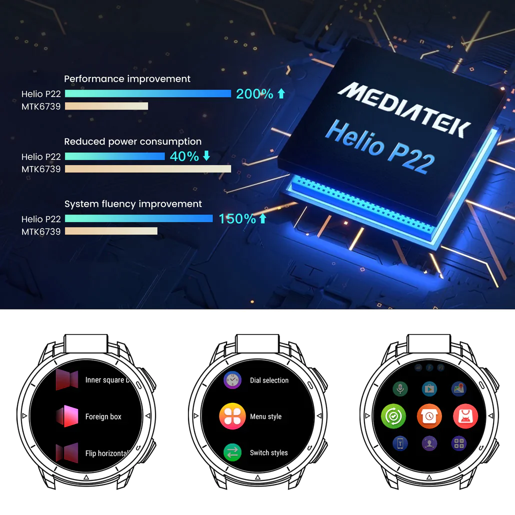 KOSPET OPTIMUS 2 not only adopts Helio P22, a high-end chip from MTK produced on an advanced 12nm manufacturing process, but harnesses eight A53 cores and IMG8320 GPU, the strongest chip currently applied in a smartwatch.