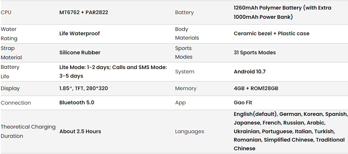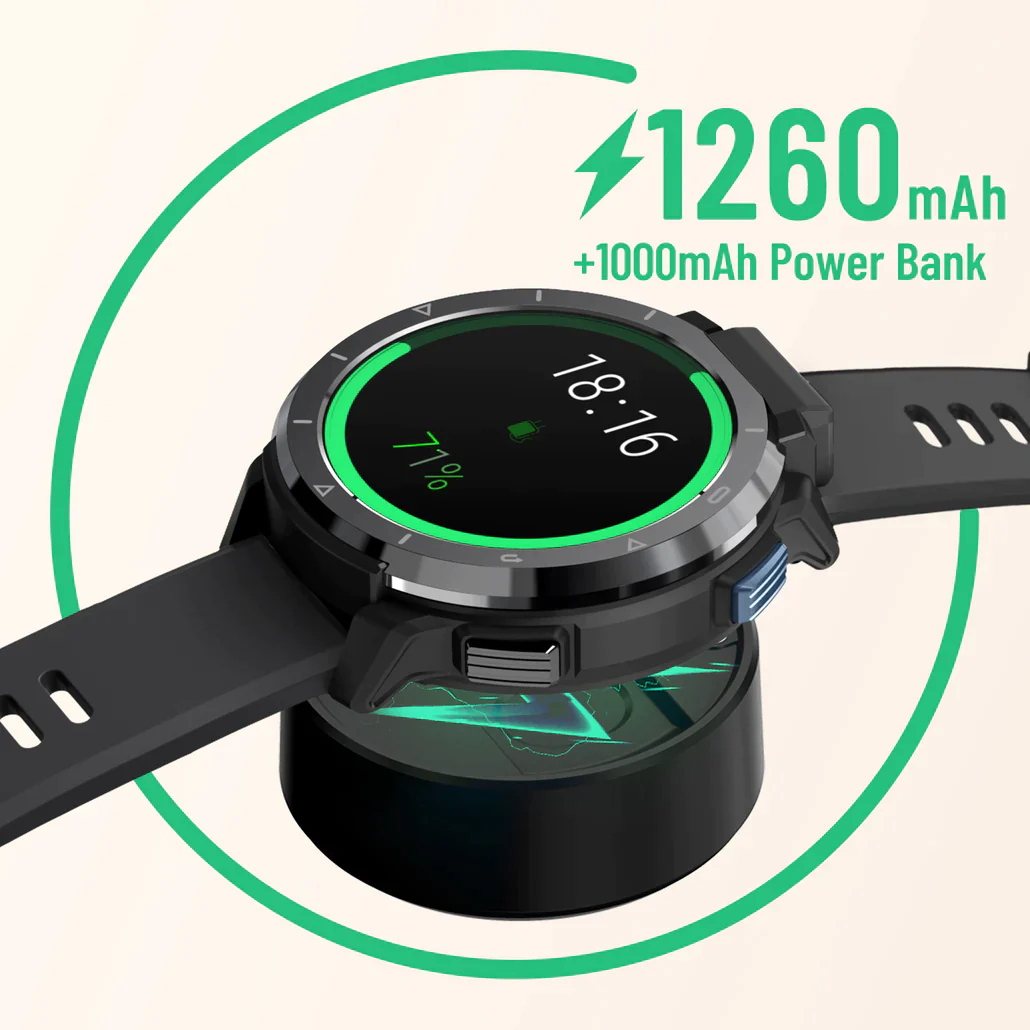 In addition to the 1260mAh lithium polymer battery, KOSPET OPTIMUS 2 comes with an additional 1000mAh power bank, so that you can charge your smartwatch even on the go.